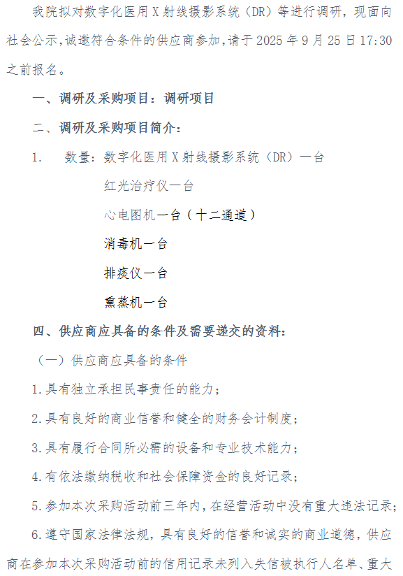 自流井区中医院关于数字化医用x射线摄影系统(DR)等进行调研公告