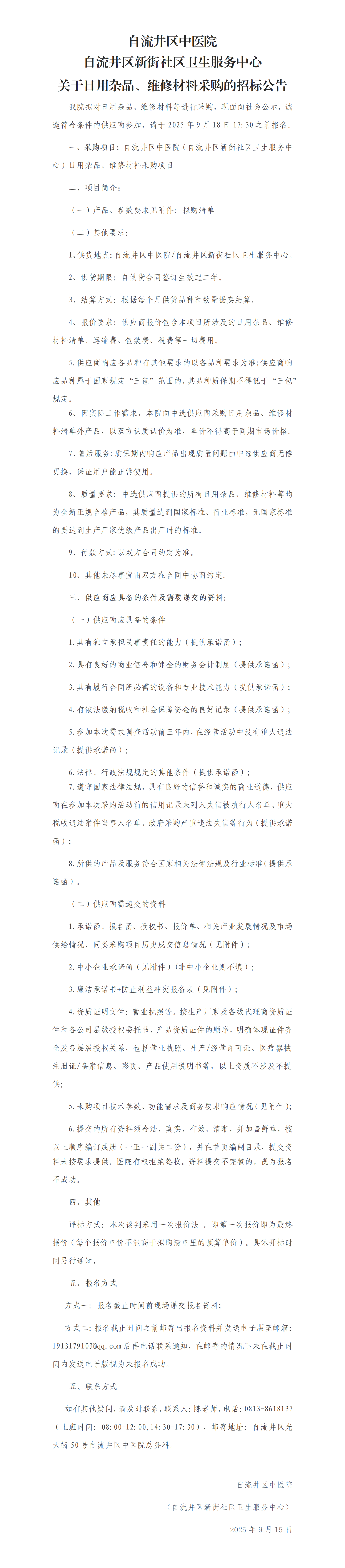 自流井区中医院(自流井区新街社区卫生服务中心)日用杂品、维修材料采购的招标公告