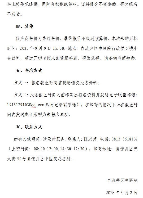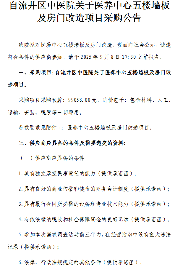 自流井区中医院关于医养中心五楼墙板及房门改造项目采购公告