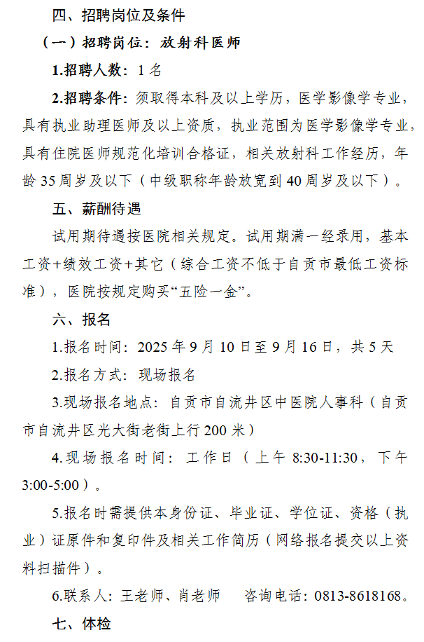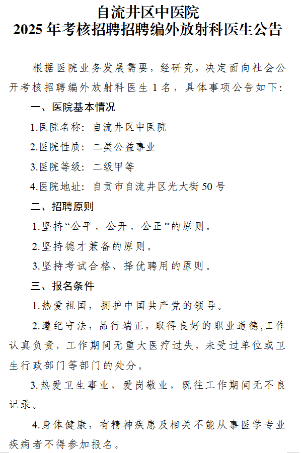 自流井区中医院2025年考核招聘招聘编外放射科医生公告