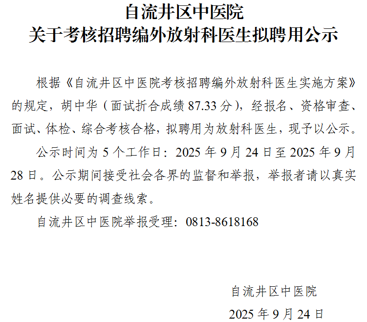 自流井区中医院关于考核招聘编外放射科医生拟聘用公示