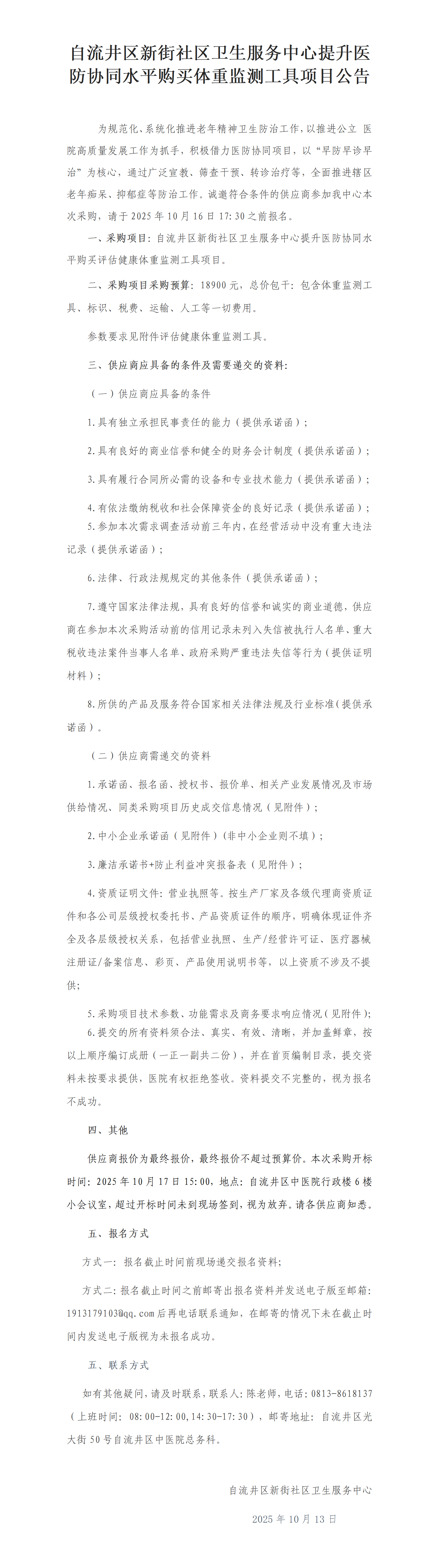 自流井区新街社区卫生服务中心提升医防协同水平购买体重监测工具项目公告