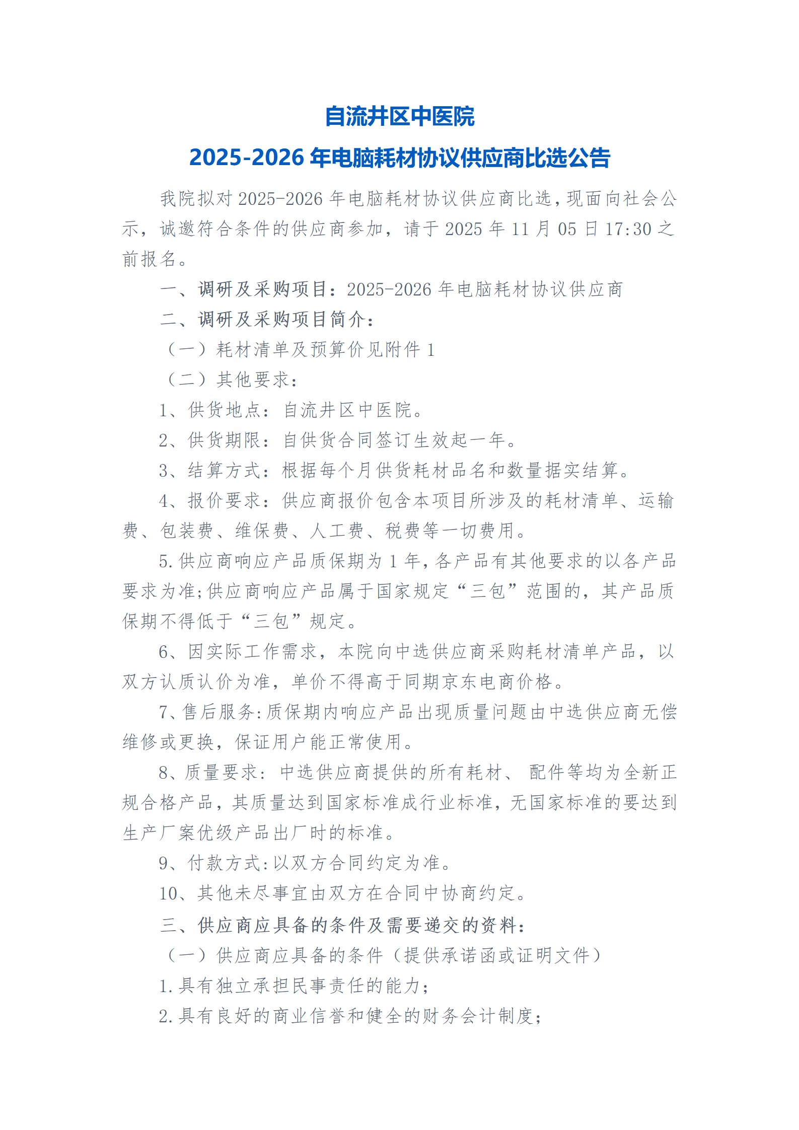 自流井区中医院2025-2026年电脑耗材协议供应商比选公告