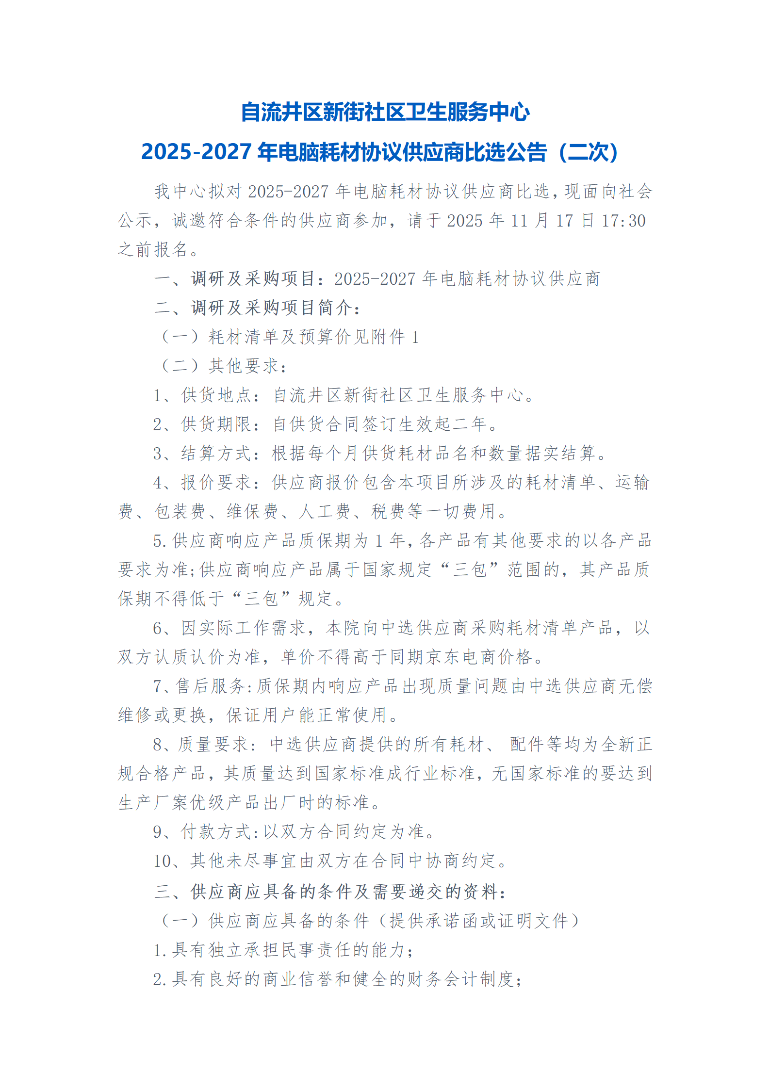 自流井区新街卫生服务中心2025-2027年电脑耗材协议供应商比选公告(二次)