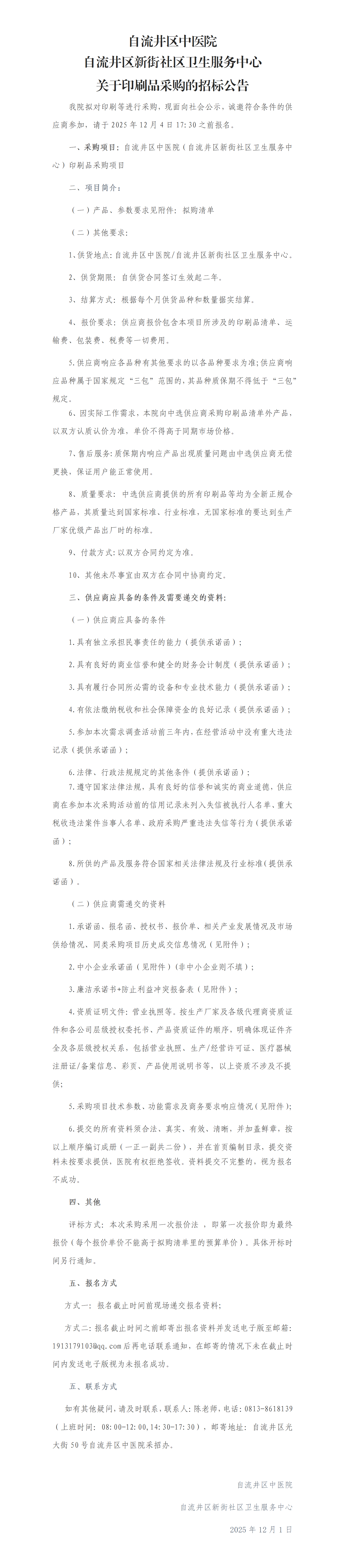 自流井区中医院(自流井区新街社区卫生服务中心)关于印刷品采购的招标公告