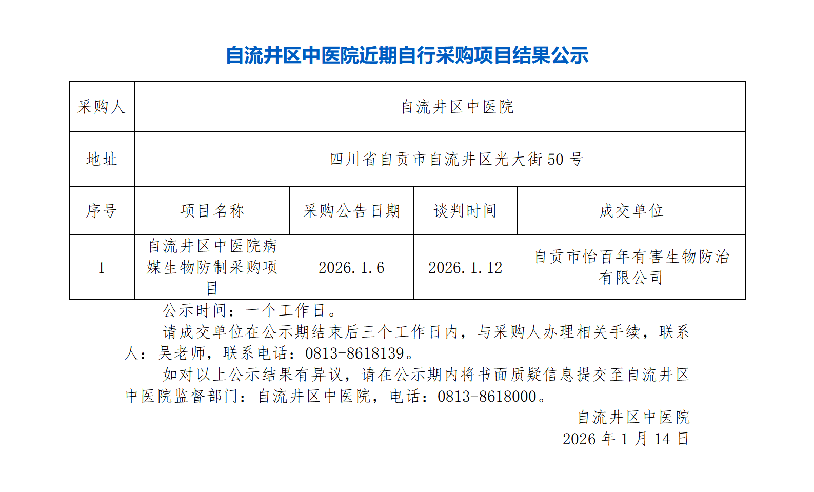 自流井区中医院近期自行采购项目结果公示