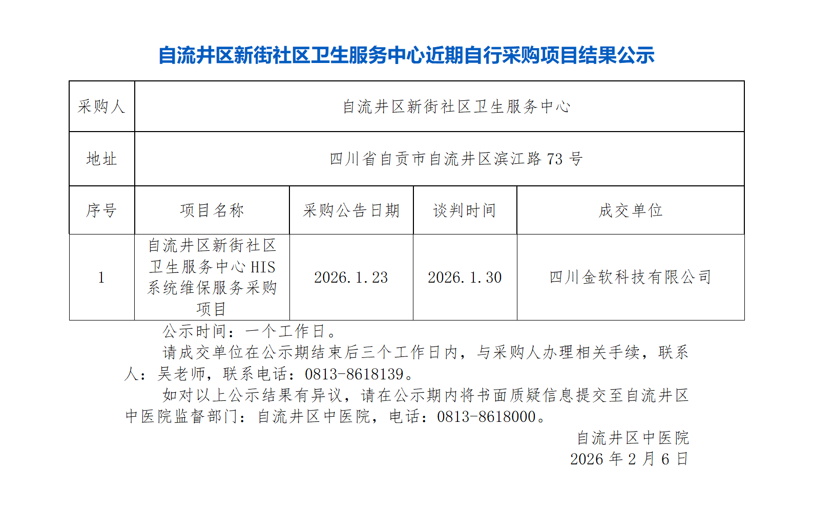 自流井区新街社区卫生服务中心近期自行采购项目结果公示