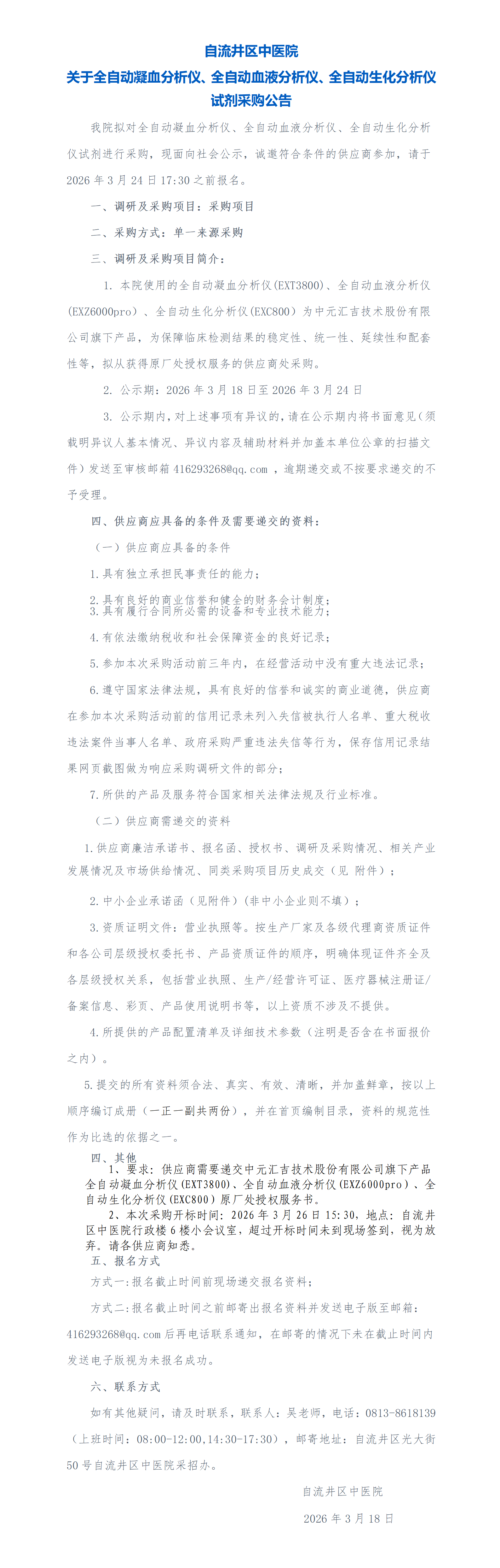 自流井区中医院关于全自动凝血分析仪、全自动血液分析仪、全自动生化分析仪试剂采购公告
